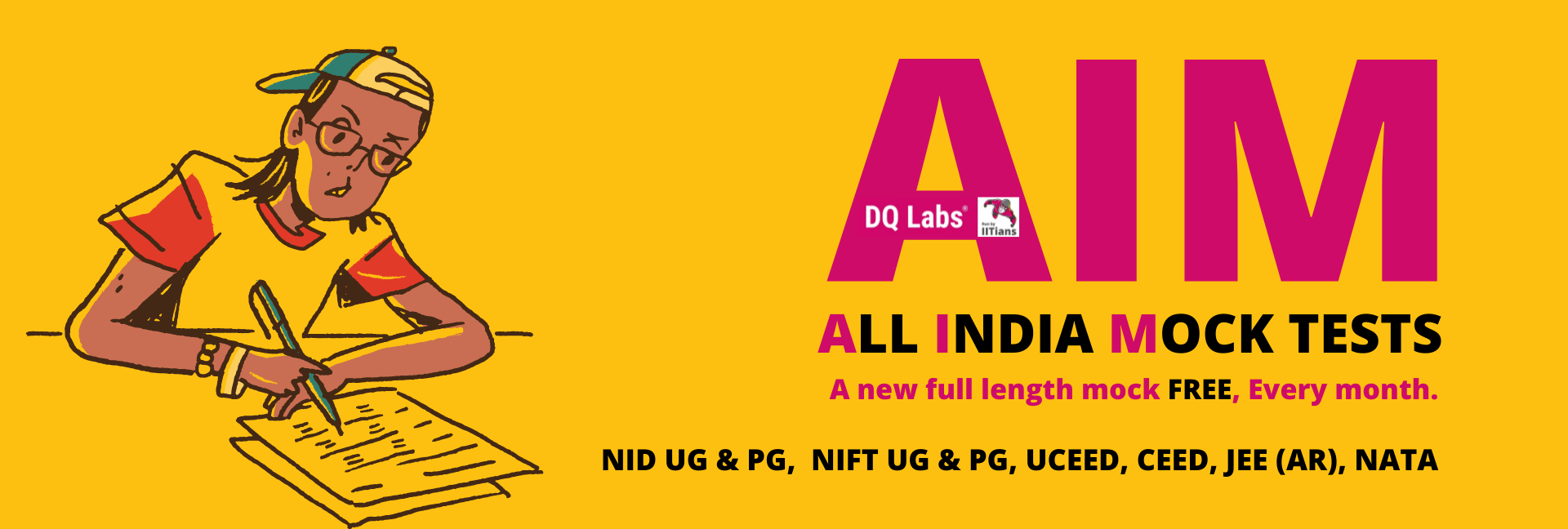 AIM (All India Monthly Mock tests is for all the design aspirants who are aiming to crack the creative entrance exams like NID DAT – UG or PG, NIFT CAT and GAT – UG or PG, UCEED, CEED, JEE P2, NATA or other private design school entrance exams. The design aspirants take the respective AIMS monthly for FREE during the scheduled time of the test to know where they stand among the All India test takers