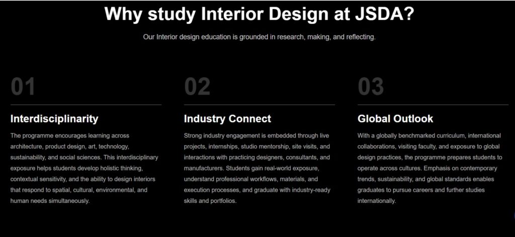 JSDA offers a diverse and forward-looking set of programmes: Bachelor of Architecture (B.Arch), Bachelor of Design (B.Des) – Interior Design, Bachelor of Design (B.Des) – Immersive Experience Design. It also provides global academic pathways through international degree collaborations: Jindal Adelaide Architecture Pathway (B.A./B.Des + B.ArchDes + M.Arch), Jindal Westminster Design Pathway (B.Des + M.A. / M.Sc.).