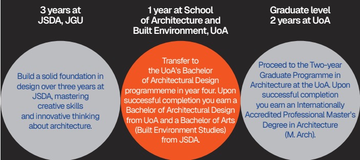 The Jindal Adelaide Architecture Pathway @JSDA is the only internationally accredited Bachelor’s and Master’s programme of Architecture in India today. Designed as a 3+1+2 year progression programme between JSDA, JGU and the School of Architecture and Built Environment (SABE), the University of Adelaide, this programme allows graduates to become a part of the global architectural workforce in over 35 countries worldwide, including, Canada, USA, Australia and New Zealand.