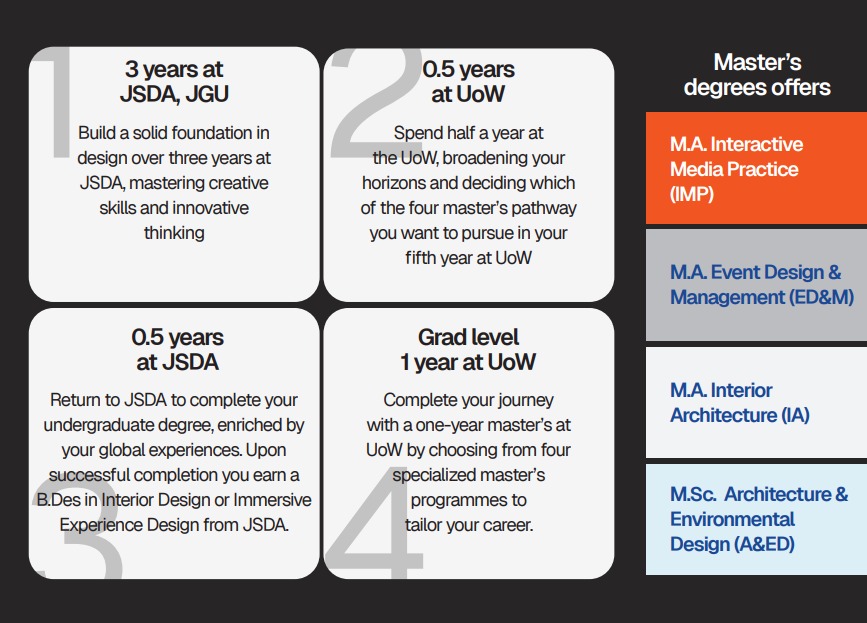 The Jindal Westminster Design Pathway at JSDA is a unique international five-year ($3.5 + 1.5$) academic program in Interior Design and Immersive Experience Design, delivered in collaboration with the University of Westminster. This pathway offers a seamless transition into multiple postgraduate specializations, including: