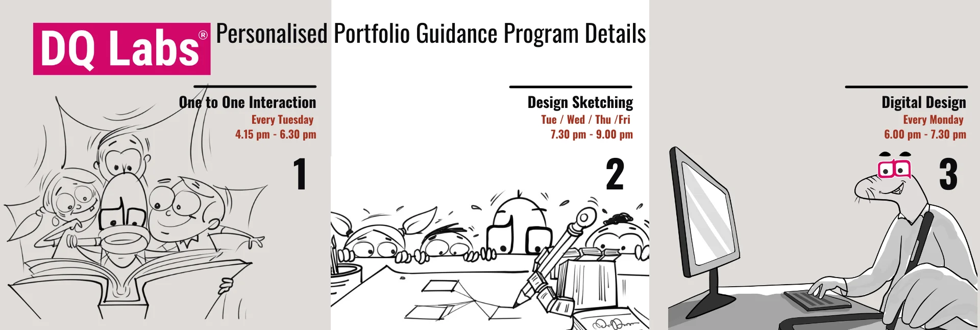 Portfolio Development Program at DQ Labs Works at 3 levels. 1. Develop Design Quotient. 2. Develop design sketching skills. 3. Develop Digital design skills. With these 3 developed levels students will be able to create and compile a wonderful portfolio under the guidance of an experienced design professional.
